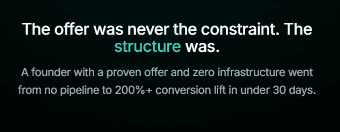 A founder with a proven offer and zero infrastructure went from no pipeline to 200%+ conversion lift in under 30 days.